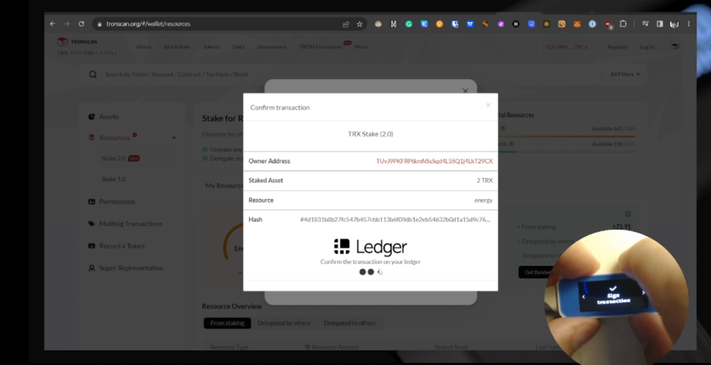- Kết nối thiết bị Ledger với TronScan (xem hướng dẫn kết nối tại đây).