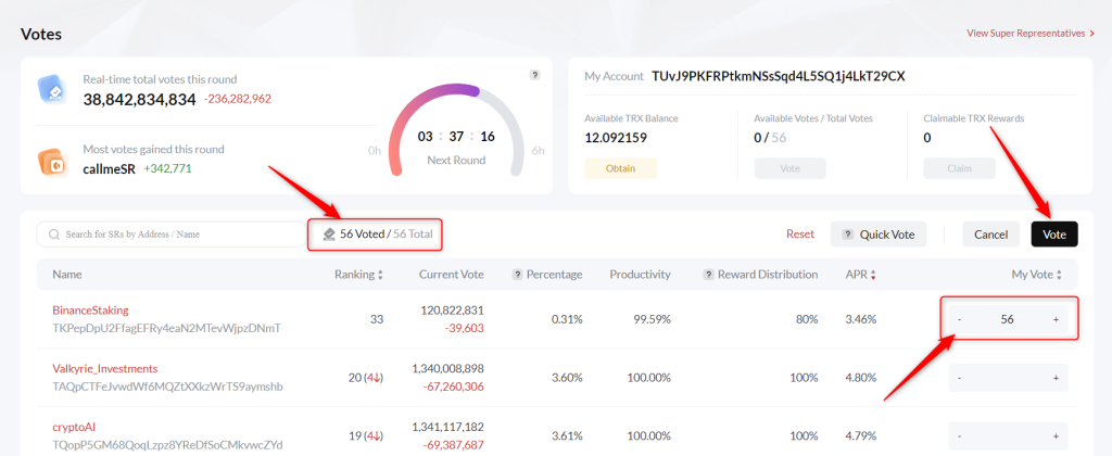 Nguồn Tron Power này có thể được dùng để bỏ phiếu cho Super Representatives, giúp bạn nhận thêm phần thưởng TRX. Chọn Vote để nhận phần thưởng. - Nếu cần, kết nối lại thiết bị Ledger với cổng Vote. Sau khi kết nối, phân bổ số phiếu cho các Super Representatives mà bạn chọn. Nhấn Vote, sau đó xác nhận giao dịch trên thiết bị Ledger để hoàn tất quá trình bỏ phiếu.