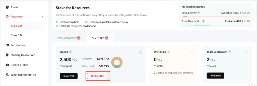 - Chọn My Stake > Unstake TRX.