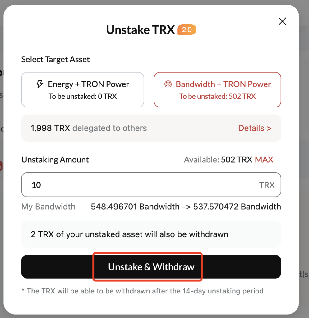 Bạn có thể unstake TRX bất kỳ lúc nào. Sau khi gửi yêu cầu unstake, TRX sẽ khả dụng để rút sau thời gian chờ 14 ngày.