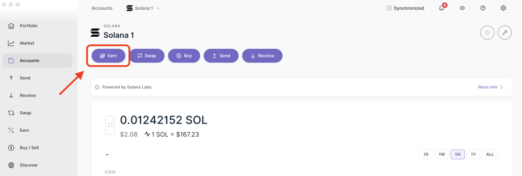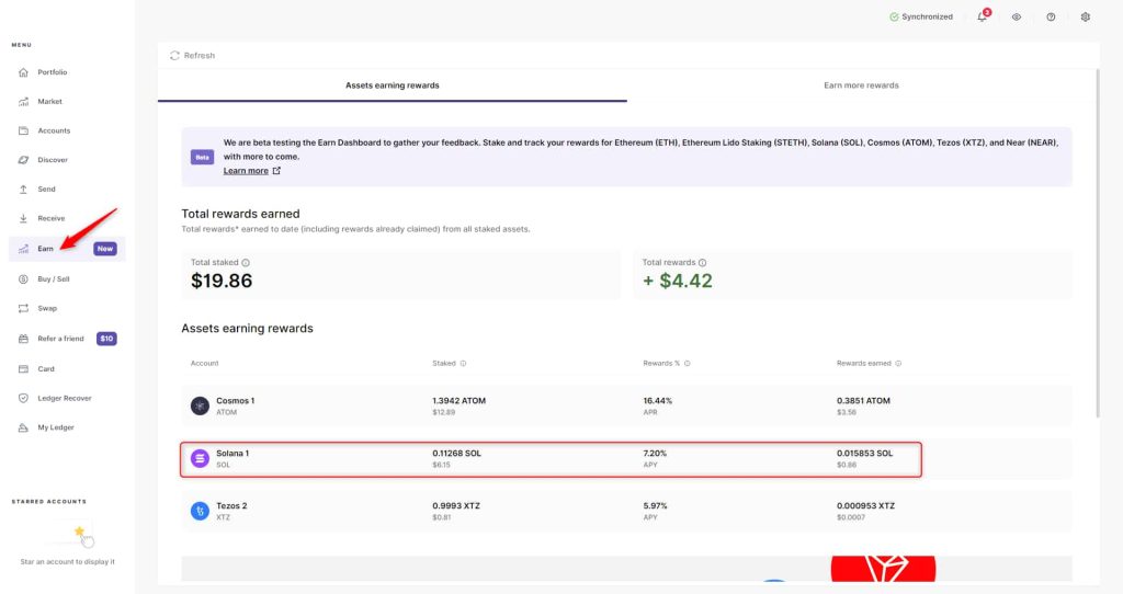 Bạn có thể dễ dàng theo dõi phần thưởng SOL của mình trực tiếp trong Ledger Wallet bằng cách sử dụng bảng điều khiển Earn (Earn dashboard).