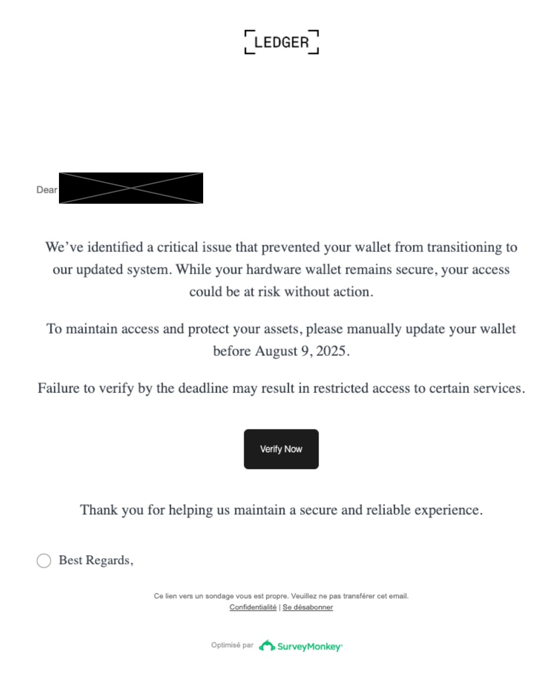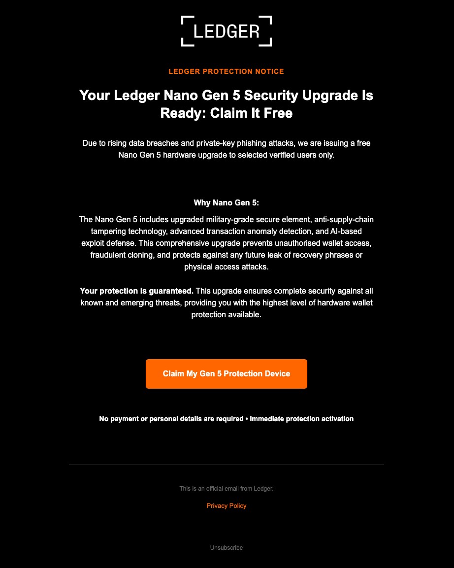 Một hình thức lừa đảo cũng thường xuyên được hacker sử dụng đó chính là các email giả mạo với nội dung yêu cầu xác minh hoặc bảo mật tài khoản. Các email này thường kêu gọi nhấp vào nút như “Verify Now”, “Secure My Account Now” hoặc “Claim My Gen 5 Protection Device”. Khi nhấp vào, người dùng sẽ bị chuyển tới website giả và được yêu cầu nhập cụm từ khôi phục.