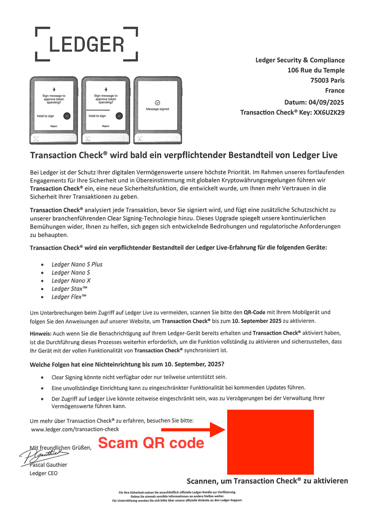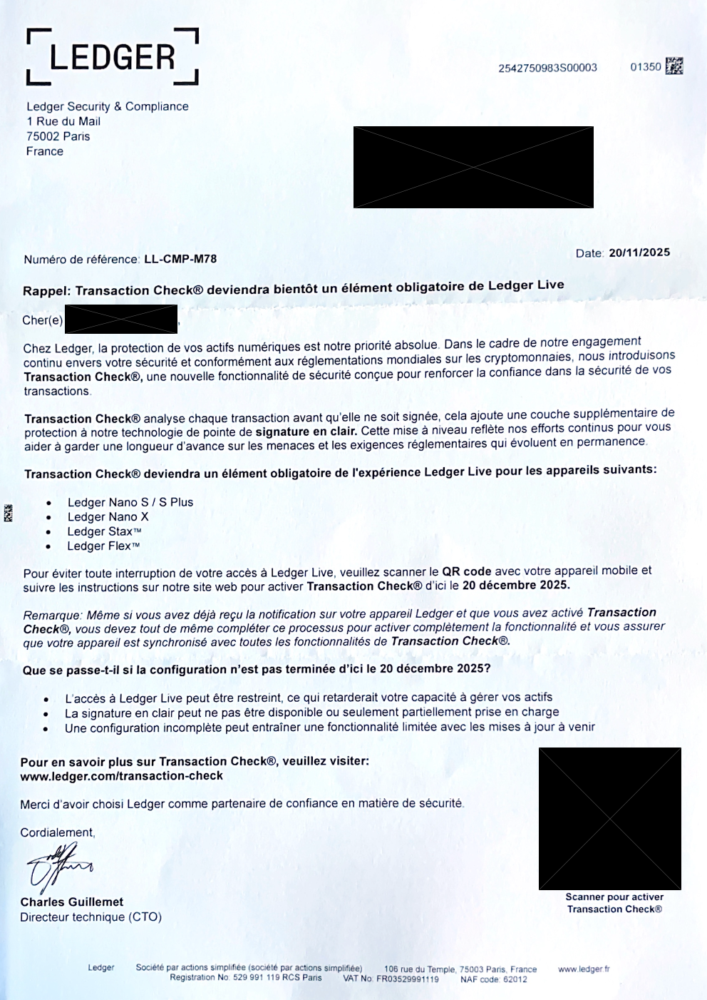 Vừa qua, một số người dùng đã phản ánh về việc nhận được thư tay của Ledger gửi qua đường bưu điện. Dù hình thức và nội dung mỗi bức thư có thể khác nhau, nhưng điểm chung là đều yêu cầu người nhận quét mã QR hoặc truy cập website, sau đó làm theo các hướng dẫn trong thư. Và ở bước cuối cùng, người dùng sẽ bị yêu cầu nhập 24 từ khôi phục.