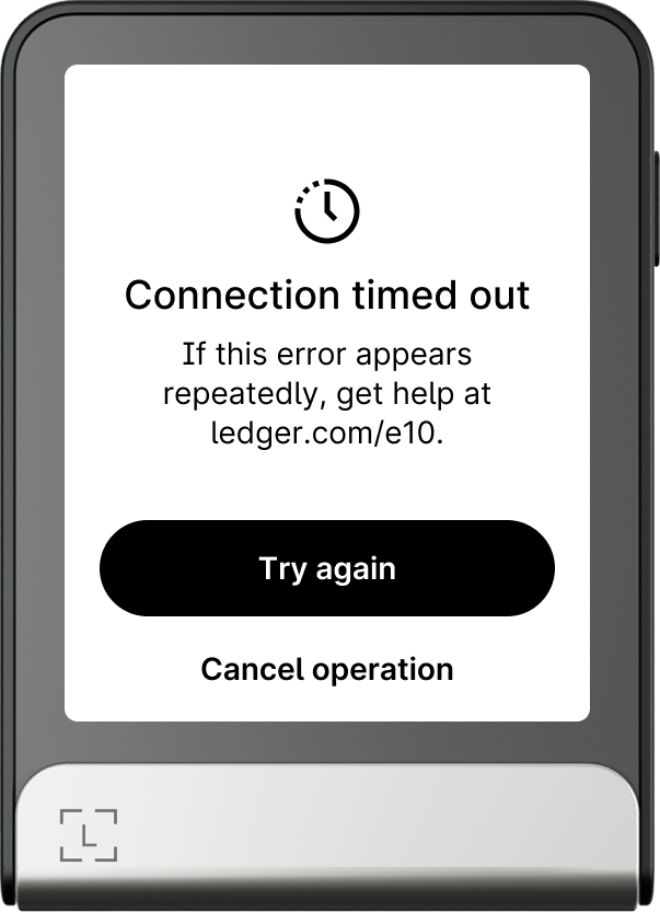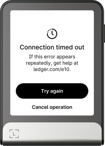 Thông báo “Connection timed out” xuất hiện khi thiết bị Ledger không phát hiện được kết nối với Ledger Recovery Key trong vòng 20 giây không hoạt động.