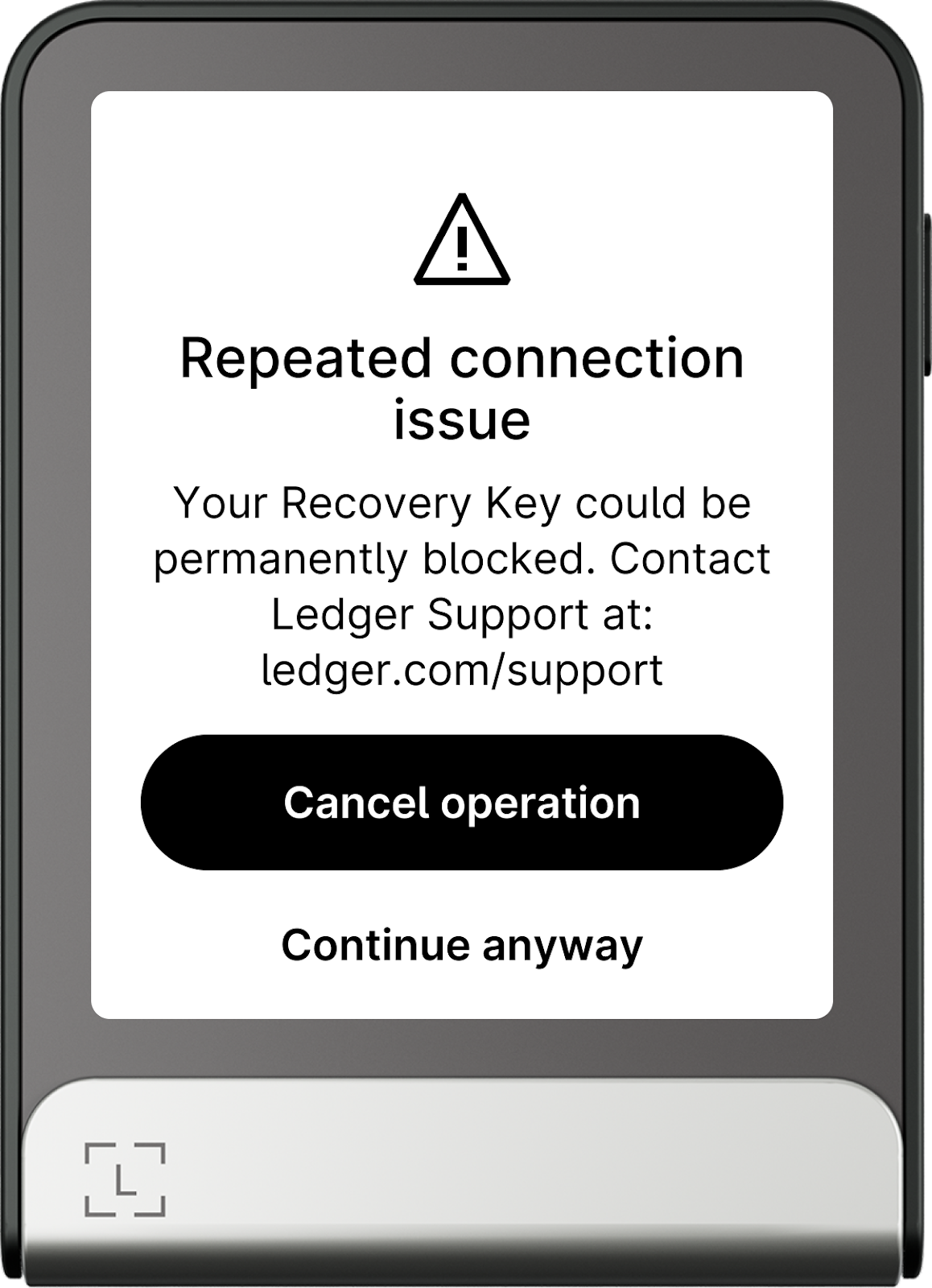 Thông báo lỗi “Repeated connection issue” xuất hiện sau khi xảy ra nhiều lần ngắt kết nối NFC liên tiếp. Đây là cảnh báo cho biết Ledger Recovery Key của bạn có thể bị khóa vĩnh viễn nếu tình trạng này tiếp tục.