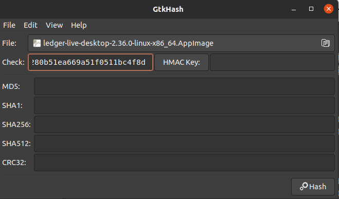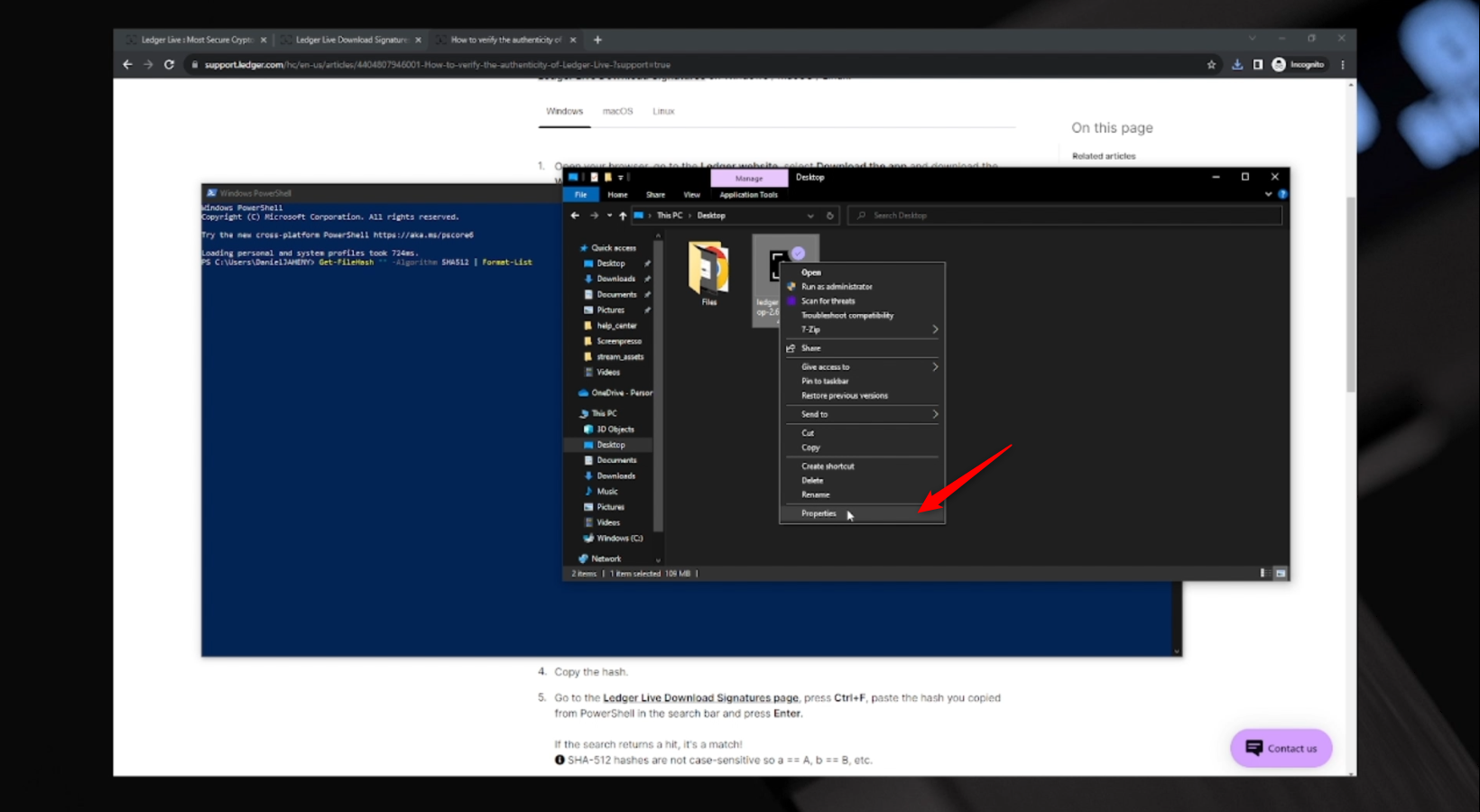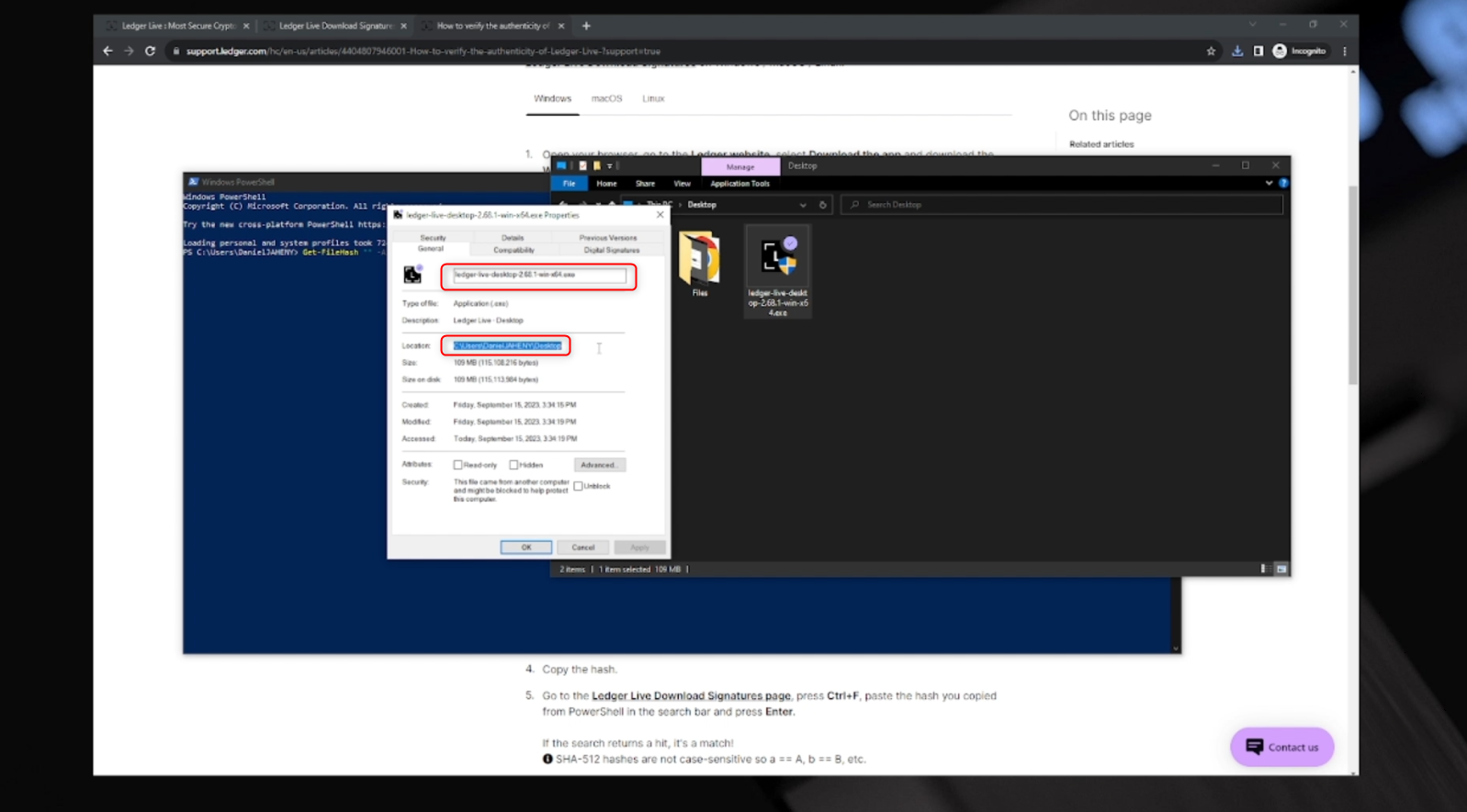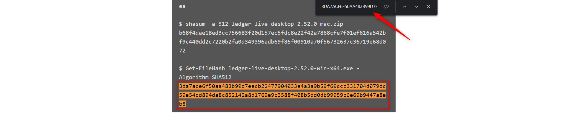 Bạn phải kiểm tra mã Hash (một chuỗi ký tự xác nhận tính toàn vẹn và xác thực của tệp) của gói cài đặt trước khi cài đặt ứng dụng Ledger Wallet. Việc kiểm tra này phải thực hiện trên tệp cài đặt đã tải về (file .exe), vì ứng dụng sau khi cài sẽ không cung cấp đúng giá trị hash. Kiểm tra Hash kỹ lưỡng giúp đảm bảo rằng tệp bạn tải xuống không bị giả mạo hoặc bị thay đổi bởi tin tặc trong quá trình tải.