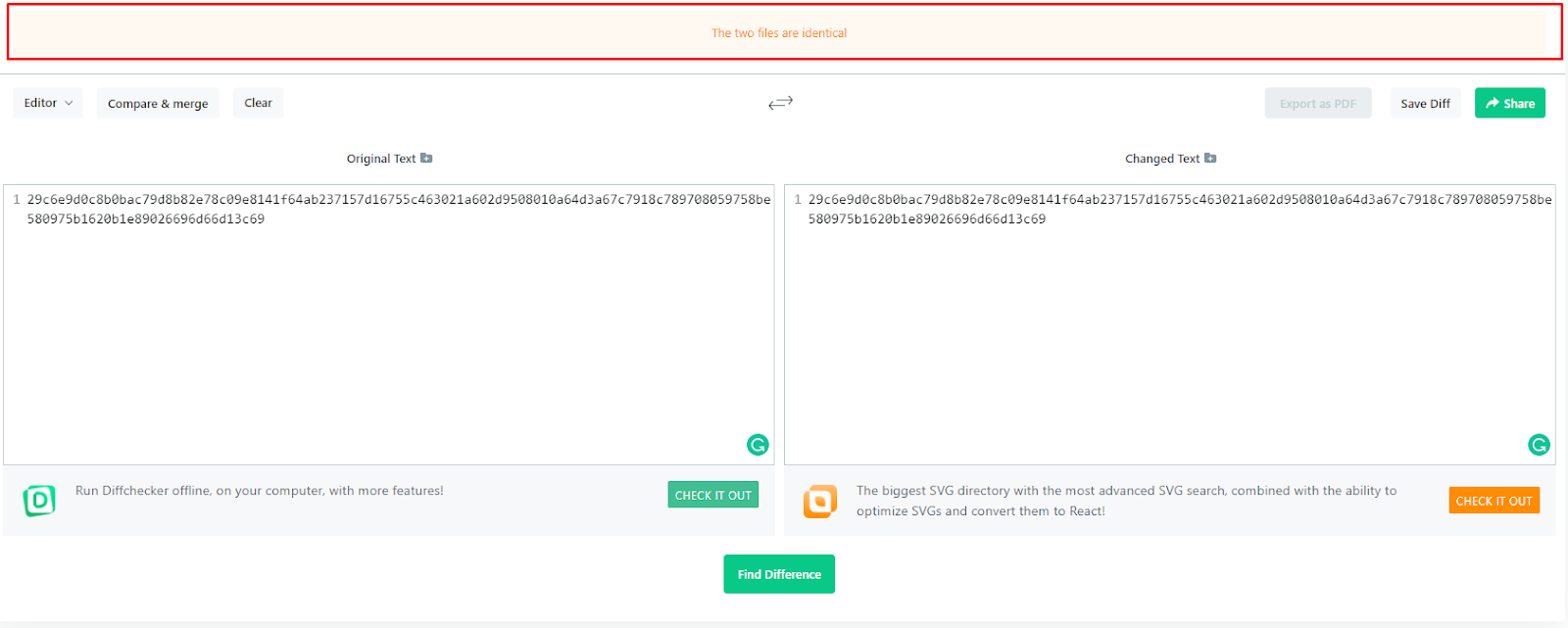 7. Sử dụng Diffchecker để so sánh xem có sự khác biệt nào giữa hash từ Terminal và hash từ Ledger Wallet Download Signatures page hay không.