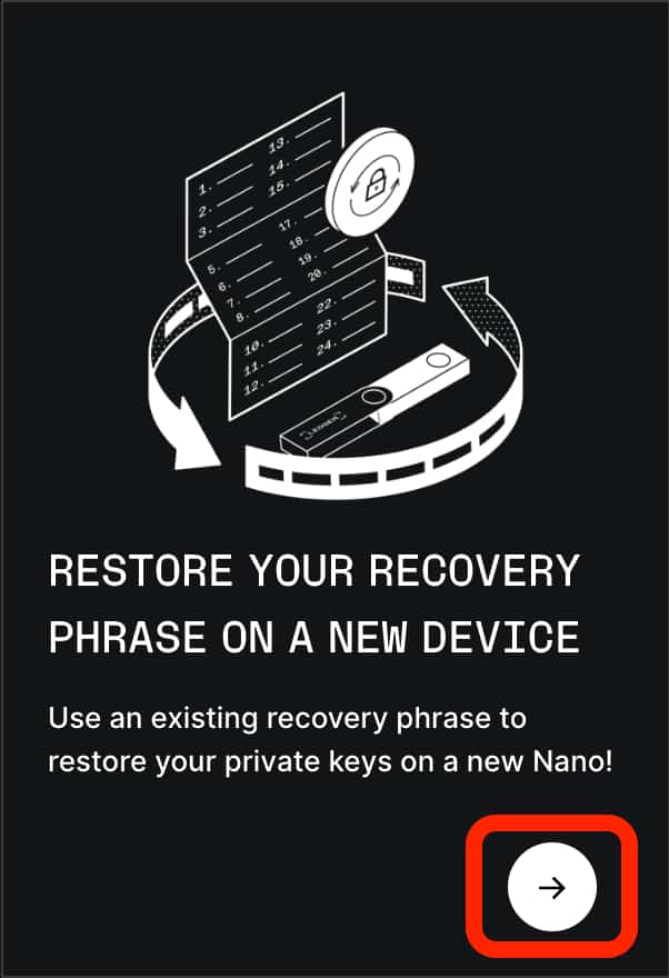 - Nếu bạn đã có cụm từ khôi phục (24 từ) và muốn khôi phục trên thiết bị Nano mới, chọn Restore your recovery phrase on a new device.