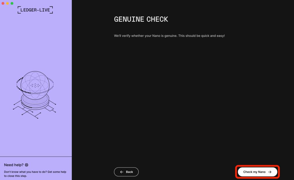 1. Nhấn Check my Nano để xác minh rằng thiết bị Ledger của bạn là hàng chính hãng.