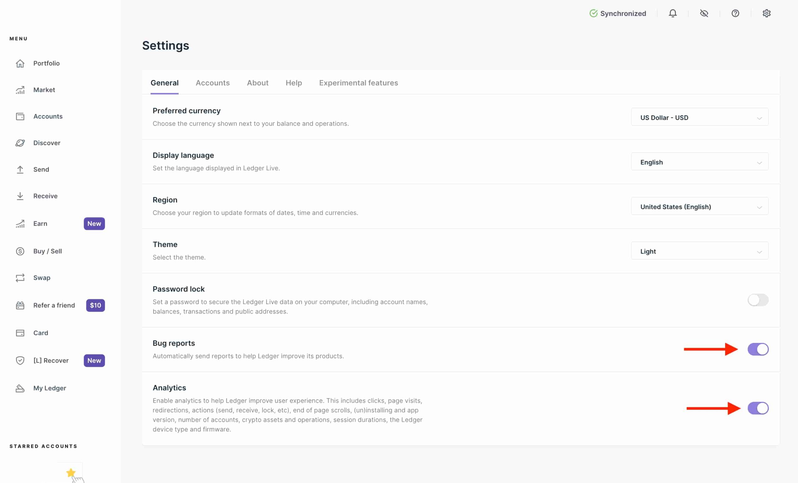 Ngoài dữ liệu kỹ thuật bắt buộc, bạn có thể chọn chia sẻ dữ liệu ẩn danh với Ledger. 1. Trong Settings → General, chọn bật/tắt: 2. Nhấn Continue để xác nhận đã đọc và đồng ý Chính sách bảo mật và Điều khoản sử dụng. 3. Nhấn Open Ledger Wallet để truy cập Portfolio.