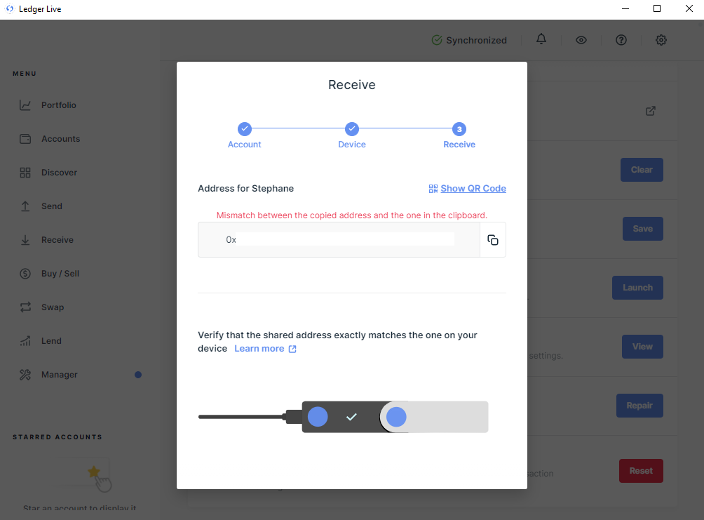 - Bạn có thể đã trở thành nạn nhân nếu địa chỉ bạn dán vào Ledger Wallet không trùng khớp với địa chỉ đích dự kiến, trên màn hình thiết bị Ledger, hoặc trên nền tảng gửi tiền.