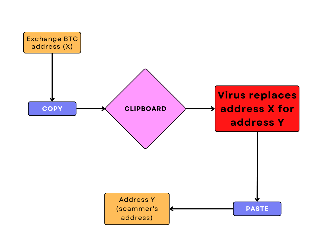 Giả sử bạn đang gửi 1 BTC đến một sàn giao dịch. Bạn sao chép địa chỉ nạp BTC từ sàn. Trong Ledger Wallet, bạn chọn gửi 1 BTC và dán địa chỉ từ clipboard. Tuy nhiên, do máy tính bị nhiễm Clipboard Highjack malware, địa chỉ trong clipboard đã bị thay thế bằng địa chỉ của kẻ lừa đảo. Nhiều người không phát hiện ra vì địa chỉ giả mạo thường có vài ký tự đầu và cuối giống địa chỉ thật, người dùng chỉ kiểm tra lướt phần đầu và phần cuối địa chỉ. Đây là cách kẻ tấn công lợi dụng thói quen kiểm tra không đầy đủ của người dùng.