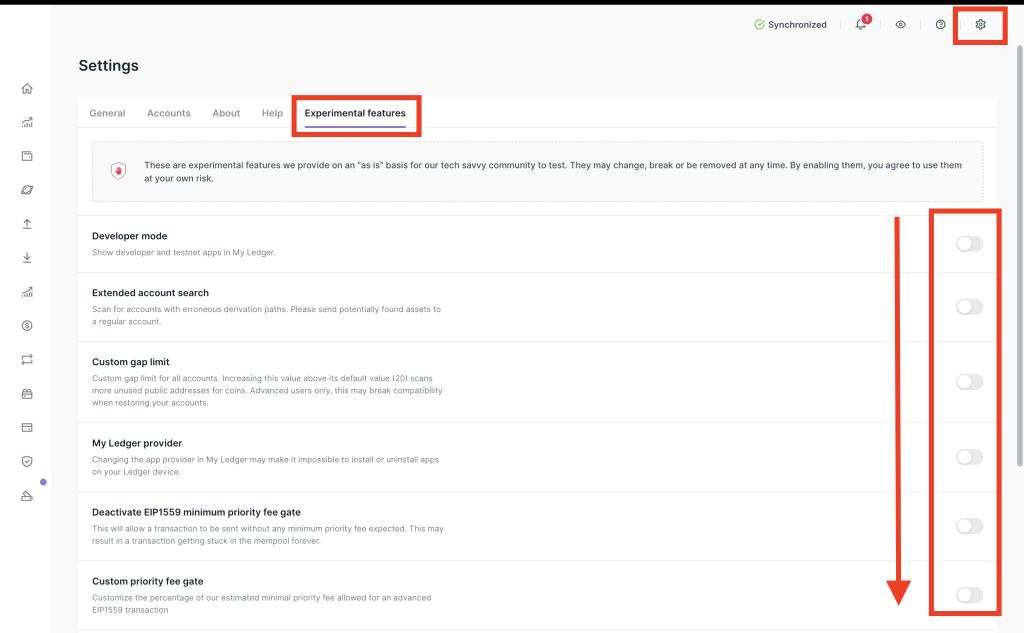 Ledger Wallet có mục Experimental Features trong phần Settings. Trong một số trường hợp hiếm, các tính năng thử nghiệm có thể làm gián đoạn kết nối với blockchain explorer, dẫn đến hiển thị sai hoặc thiếu số dư.