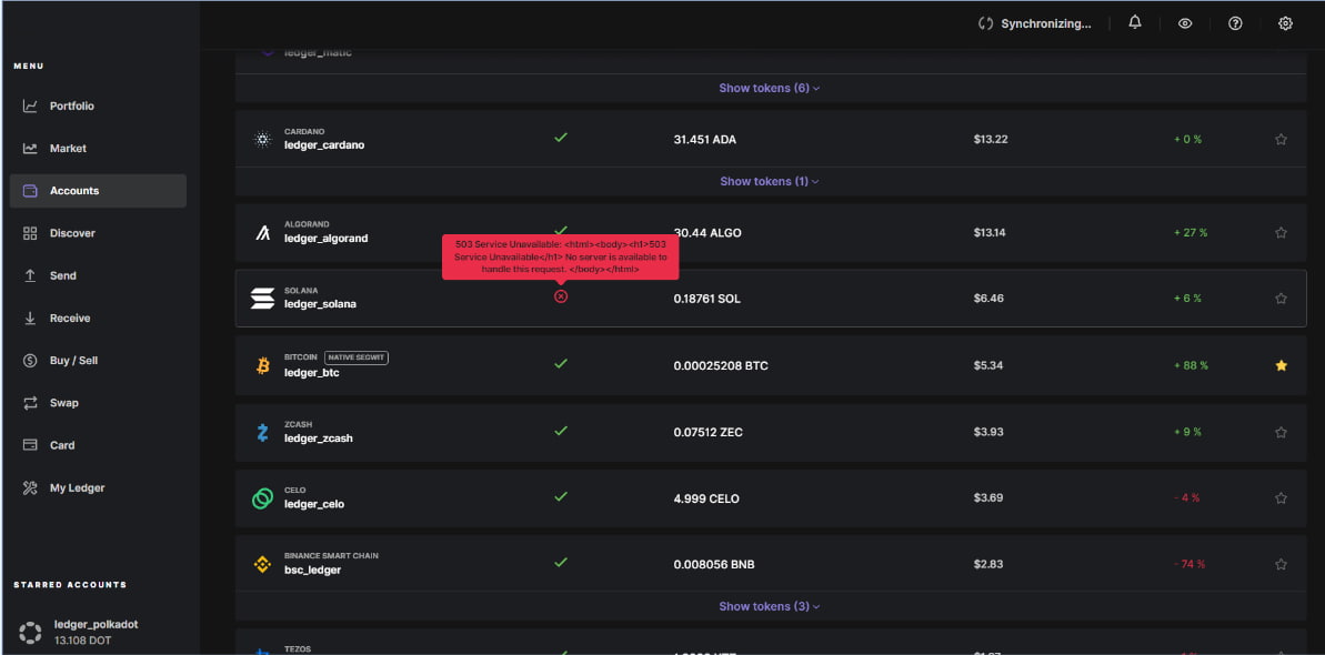 Lỗi đồng bộ hóa (synchronization error) có thể xảy ra trong Ledger Wallet (trước đây là Ledger Live) khi các trình khám phá blockchain (blockchain explorers) hoặc mạng lưới của Ledger gặp sự cố tạm thời.