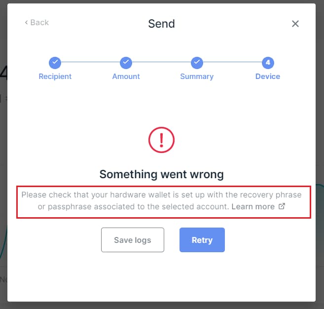 Bài viết này mô tả lỗi: “Something went wrong – Please check that your hardware wallet is set up with the recovery phrase or passphrase associated to the selected account” và cách khắc phục.