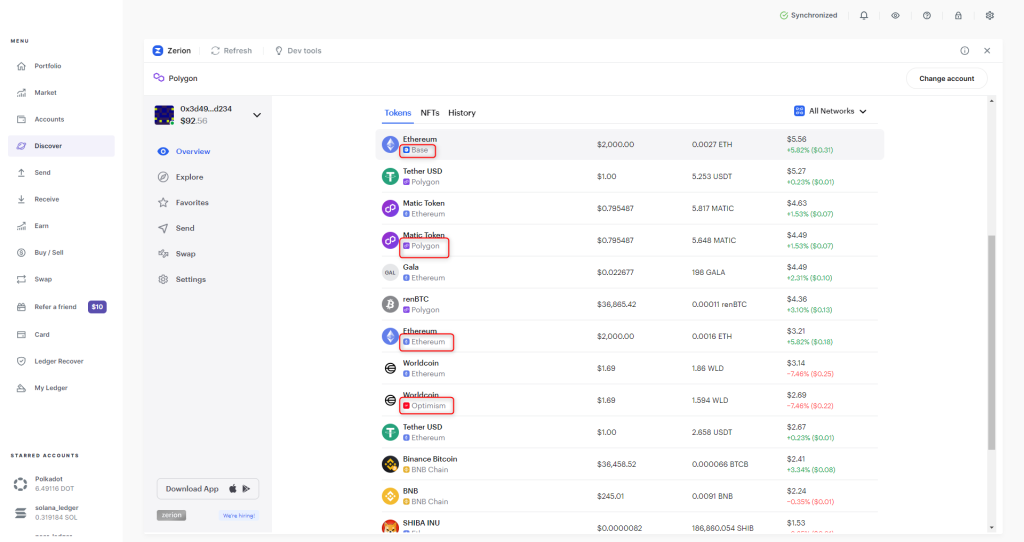 Nếu bạn không thể tìm thấy giao dịch token hoặc khoản nạp từ sàn về ví Ledger trong Ledger Wallet, hãy thử sử dụng Zerion — một công cụ quản lý danh mục đầu tư tích hợp trong Ledger Wallet.
