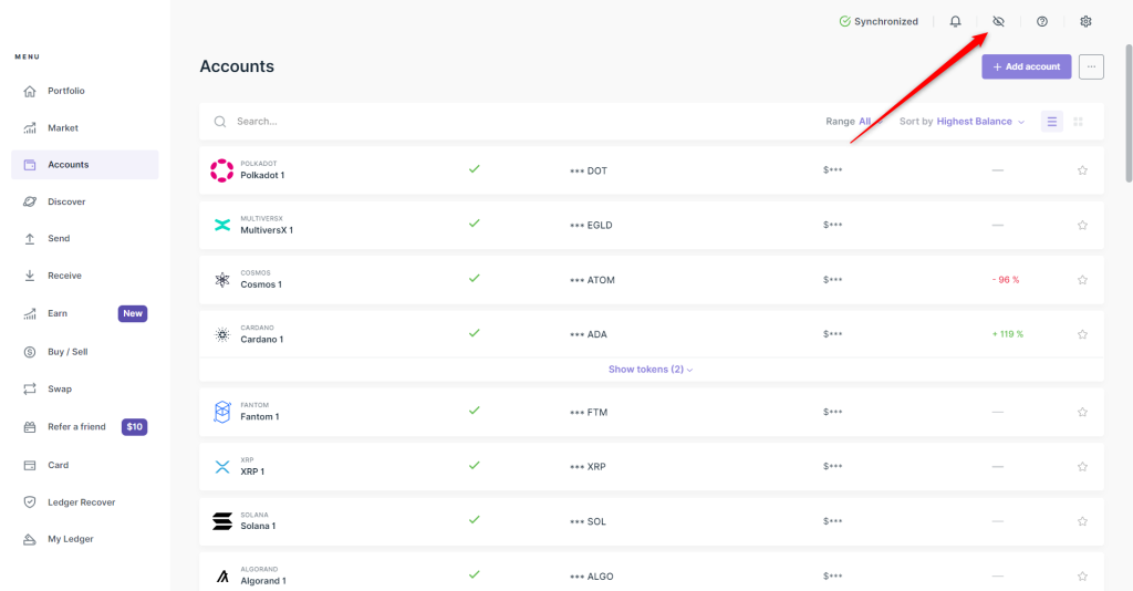 Discreet Mode giúp ẩn thông tin nhạy cảm như số dư tài khoản hoặc giá trị tài sản bằng cách thay thế chúng bằng dấu sao ($* hoặc £***). Nếu bạn thấy số dư hoặc giá trị bị ẩn trong Ledger Wallet, chỉ cần nhấn vào biểu tượng con mắt ở góc trên bên phải để tắt chế độ Discreet Mode.
