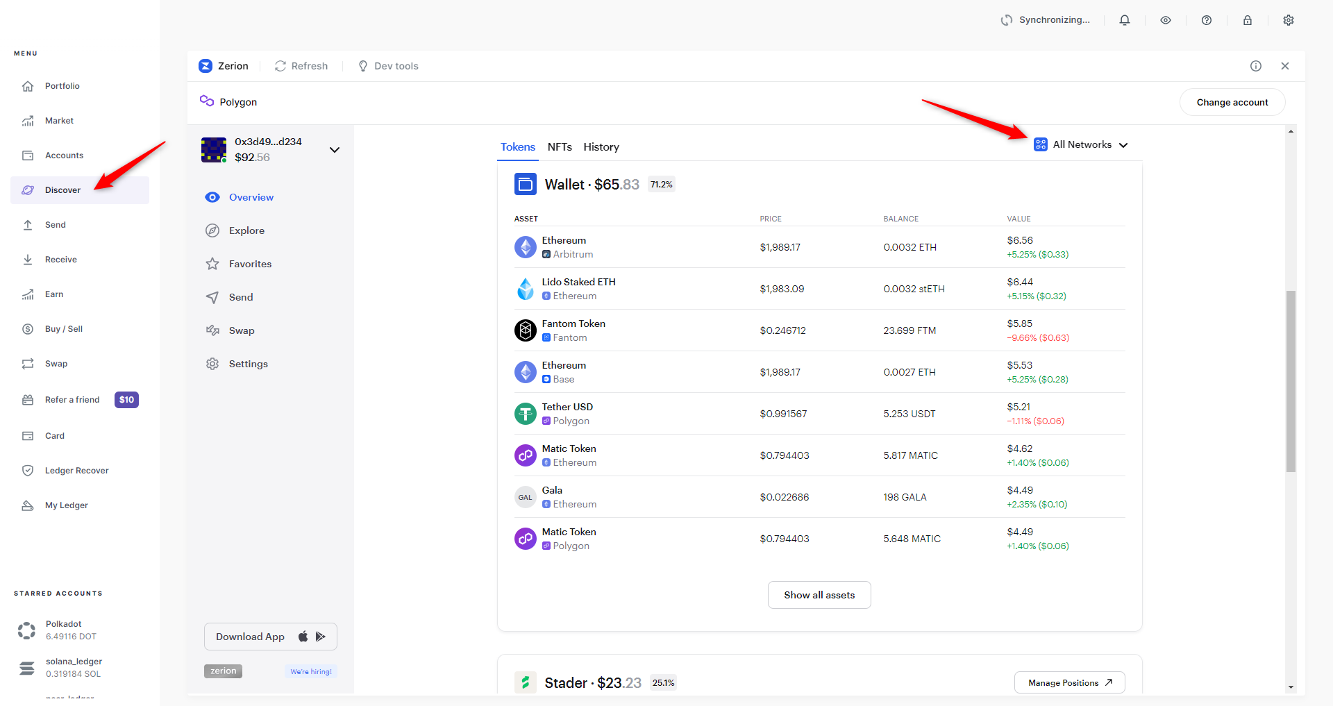 Nếu bạn không thể tìm thấy giao dịch token hoặc khoản nạp từ sàn về ví Ledger trong Ledger Wallet, hãy thử sử dụng Zerion — một công cụ quản lý danh mục đầu tư tích hợp trong Ledger Wallet.