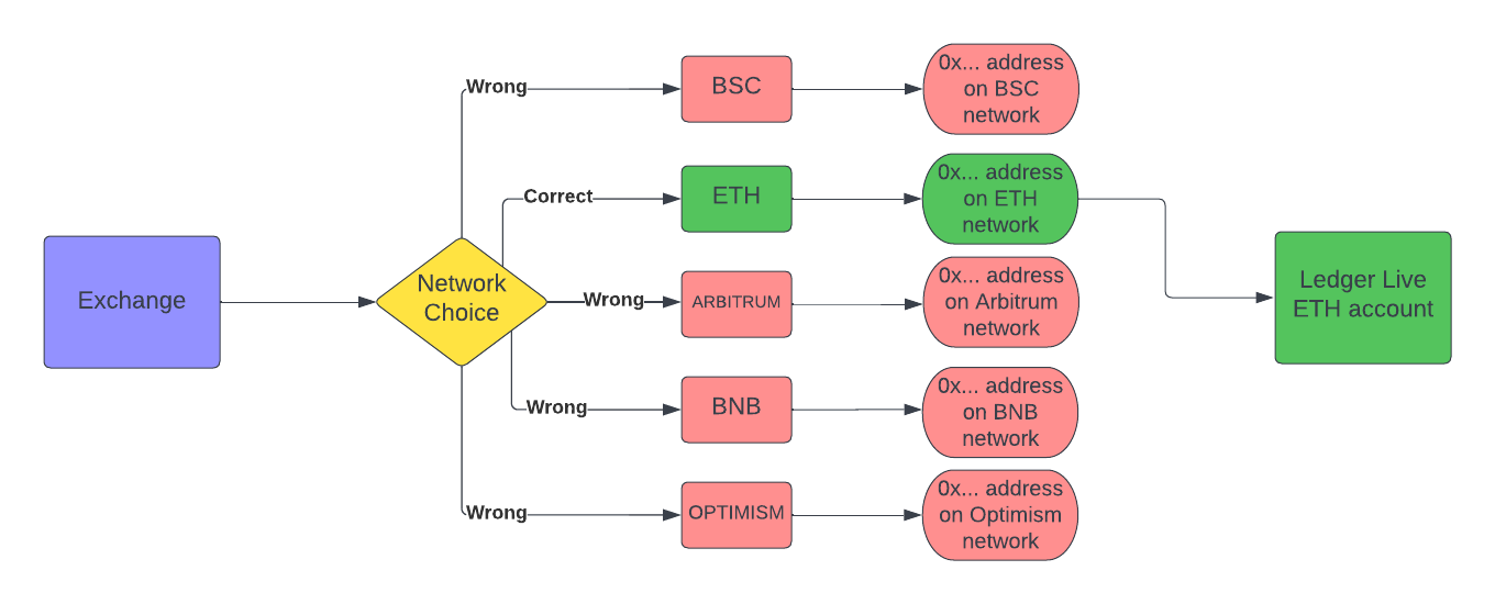 Khi rút tài sản từ sàn giao dịch về ví Ledger, bạn có thể được lựa chọn mạng (network) để thực hiện giao dịch. Việc chọn sai mạng là nguyên nhân phổ biến khiến bạn không thấy tài sản trong Ledger Wallet.