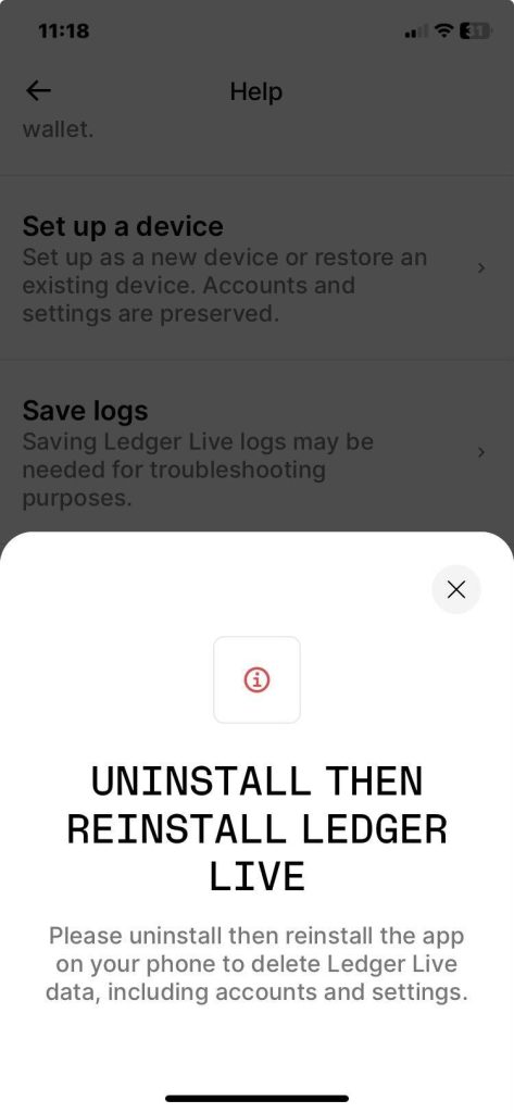 5. Ứng dụng sẽ hướng dẫn bạn gỡ cài đặt (uninstall) Ledger Wallet Mobile và cài đặt lại (reinstall).