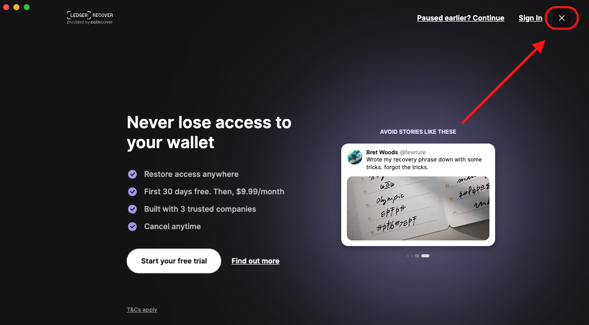 • Nếu bạn chưa đăng ký Ledger Recover, chỉ cần nhấn “x” để đóng.