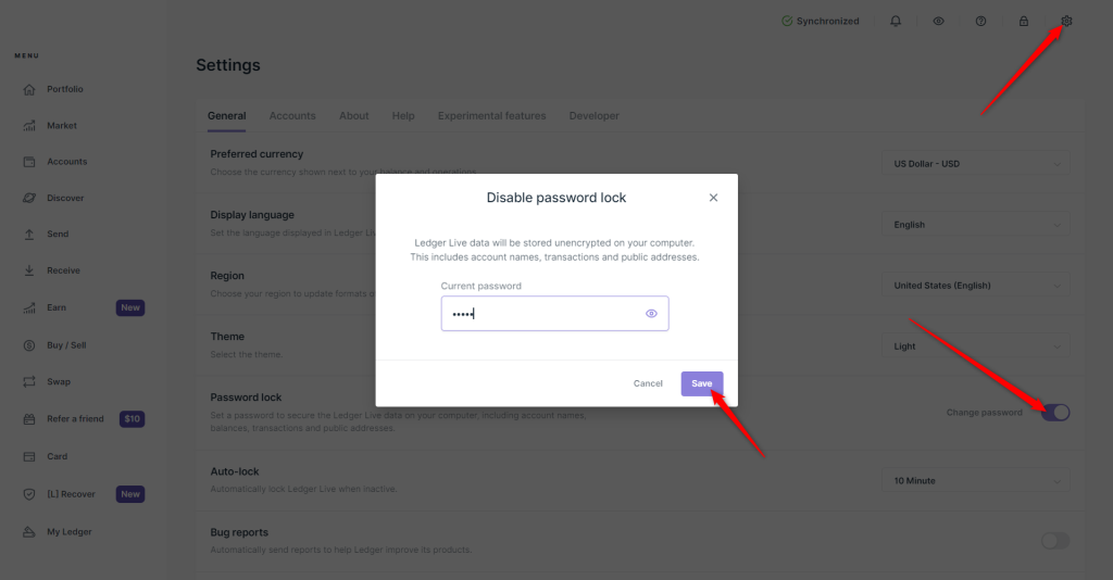 Để vô hiệu hoá mật khẩu, vào mục Settings (Cài đặt) trong Ledger Live, chọn tab General (Tổng quan) và nhấn vào nút gạt (toggle) để tắt mật khẩu. Bạn cần nhập mật khẩu hiện tại của bạn và nhấn Save (Lưu) để xác nhận.