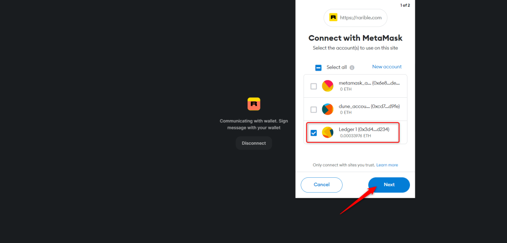 5. Chọn tài khoản Ledger của bạn và nhấp Next.