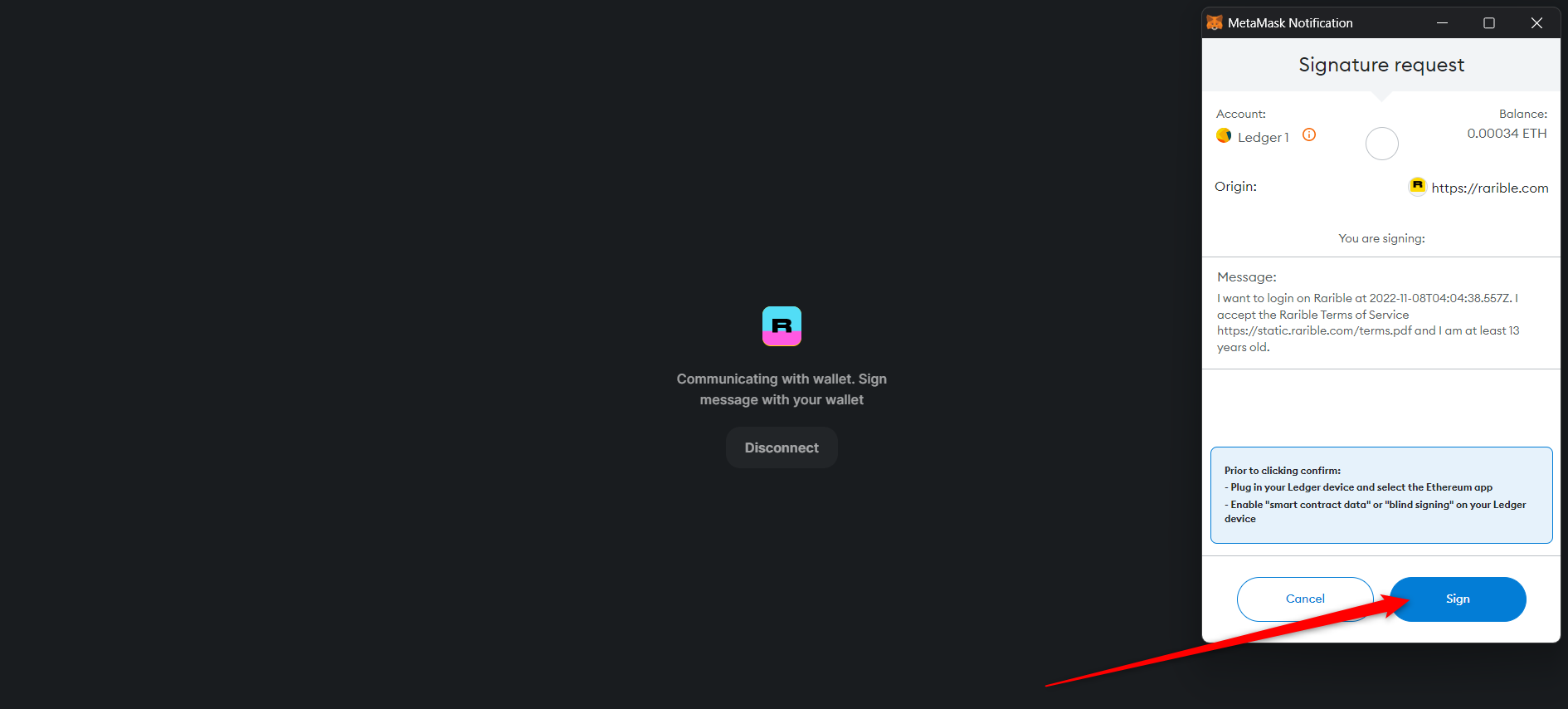 7. Dùng các nút điều hướng để xem chi tiết thông điệp trên màn hình Ledger. Nếu mọi thông tin chính xác, di chuyển đến Sign message và nhấn đồng thời cả hai nút để ký giao dịch. Tài khoản Ledger của bạn đã được kết nối với Rarible.