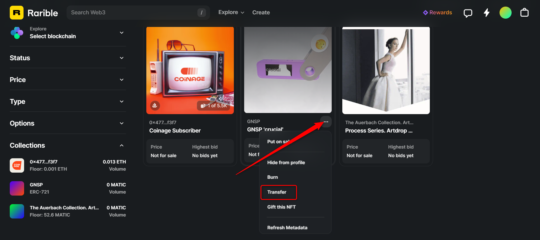 1. Trong bộ sưu tập NFT, chọn NFT muốn chuyển → nhấn … > Transfer.