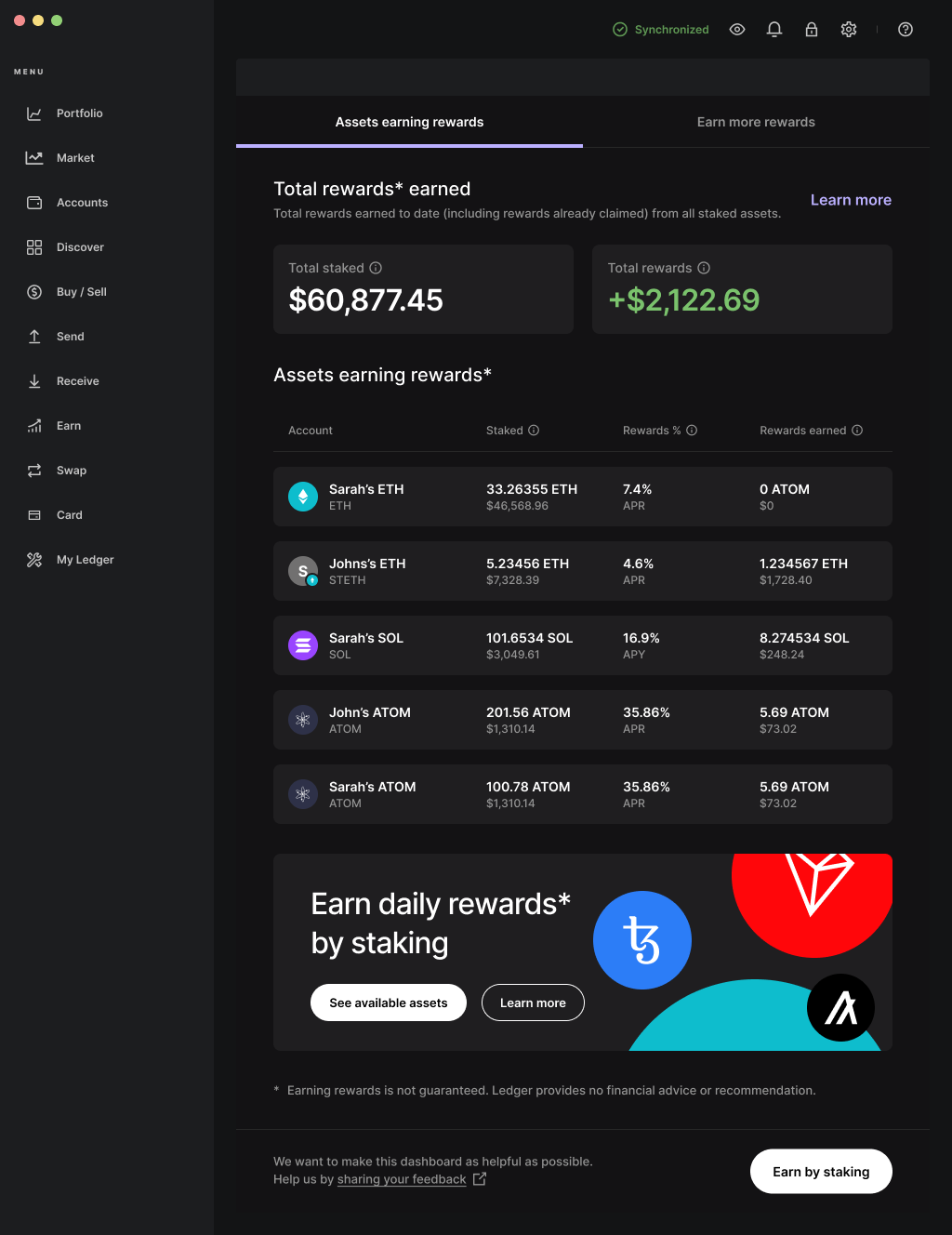 Mục Earn trong ứng dụng Ledger Wallet (Ledger Live) cho phép bạn theo dõi phần thưởng* và khám phá các cơ hội staking trên nhiều blockchain mà không cần phải truy cập nhiều nền tảng hay giao diện khác nhau. Trong mục Earn, bạn có thể dễ dàng xem: Tất cả tài sản đã stake và tài sản đủ điều kiện để stake, APR/APY, phần thưởng đã nhận được.