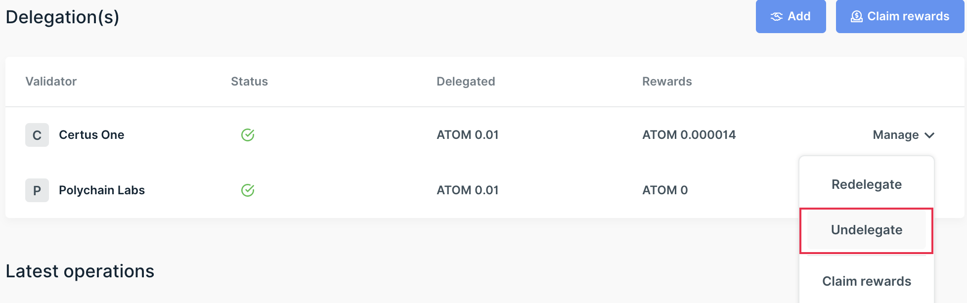 - Trong Delegation(s) list → nhấn Undelegate qua nút Manage của validator.