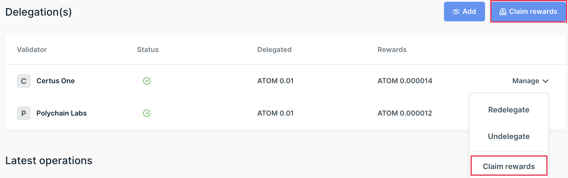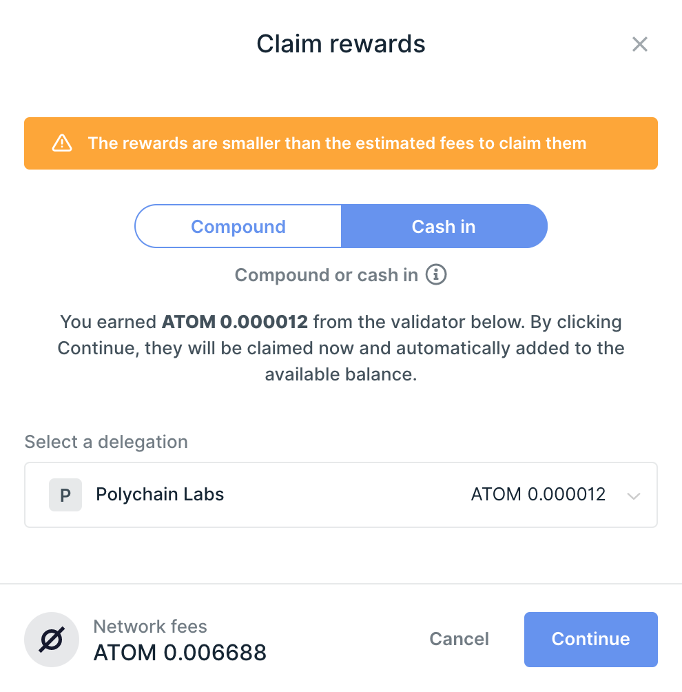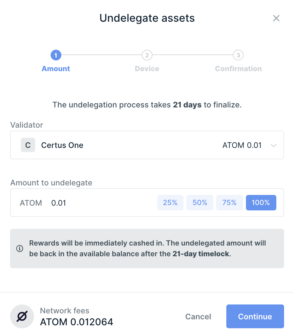 Lưu ý: Khi bạn hủy ủy quyền (undelegate) tài sản, phần thưởng đang chờ xử lý (pending rewards) sẽ được tự động ghi nhận (cash-in). Quá trình này không tạo ra một giao dịch.