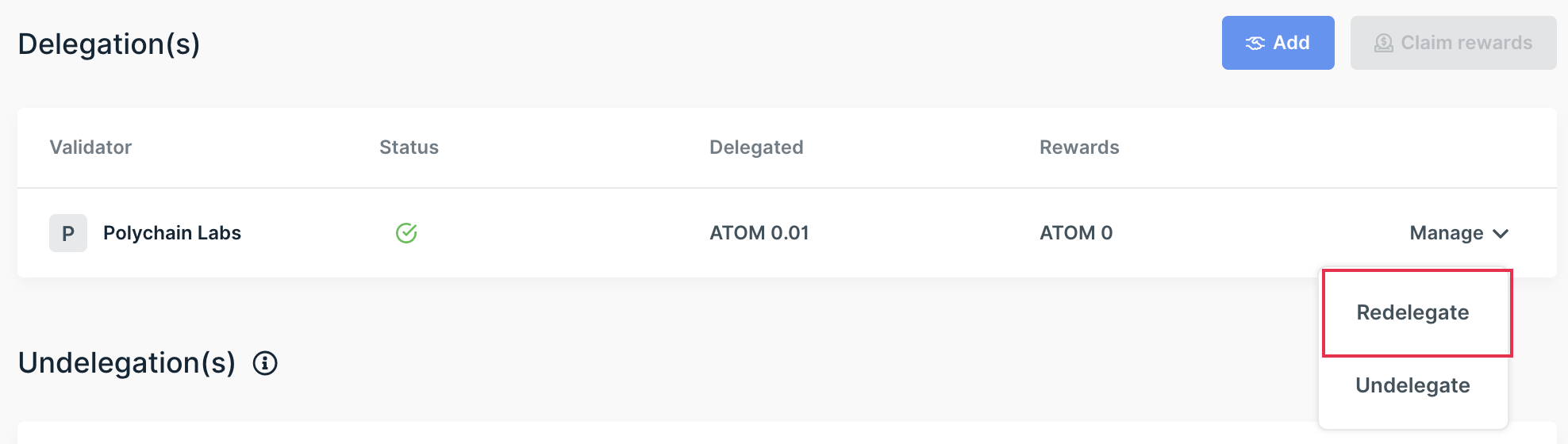 - Trong danh sách Delegation(s) → nhấn Redelegate.