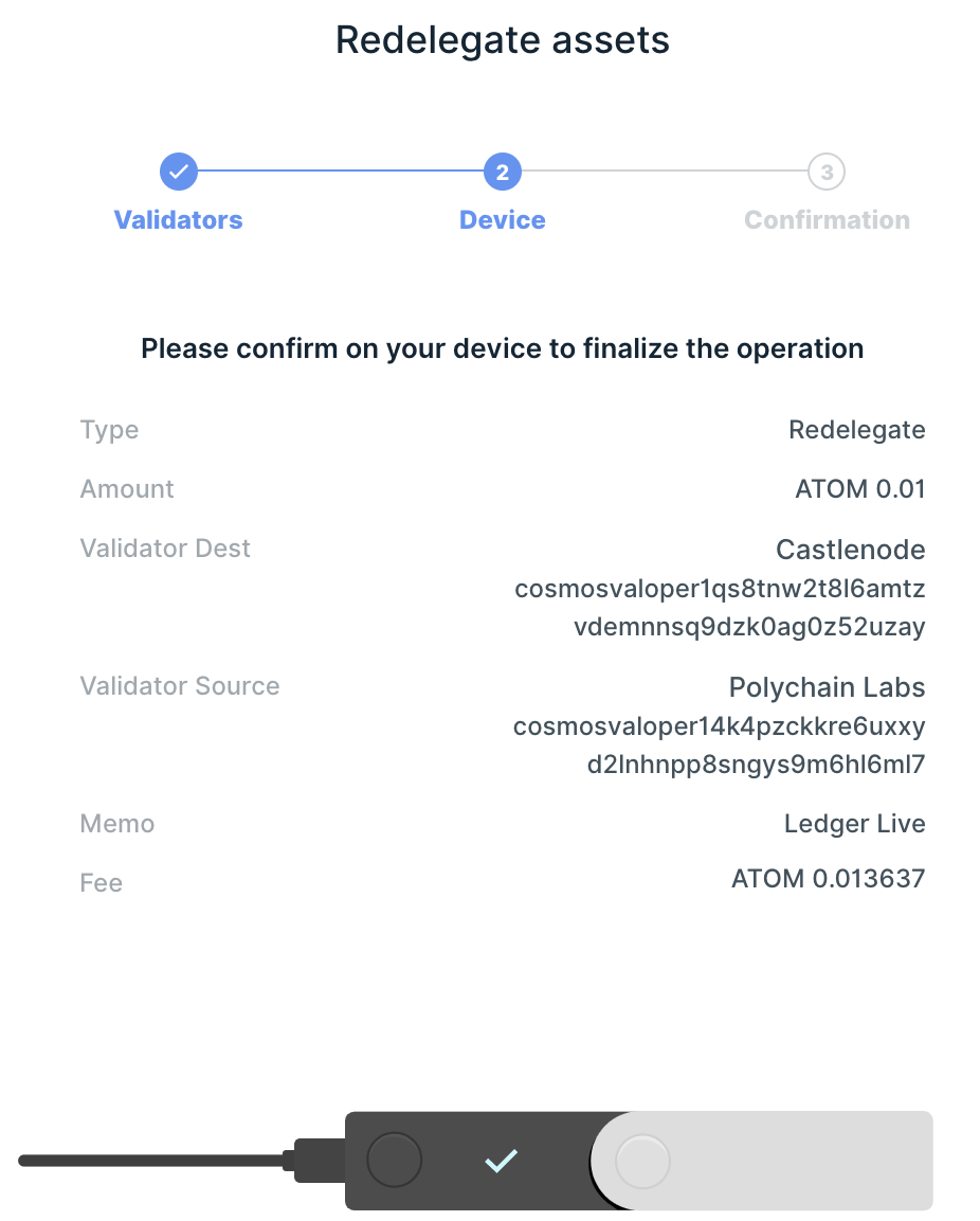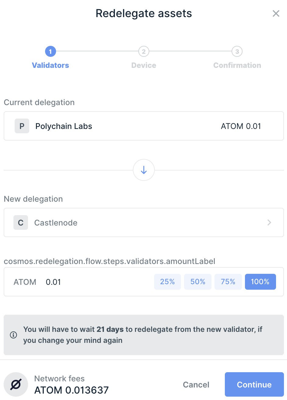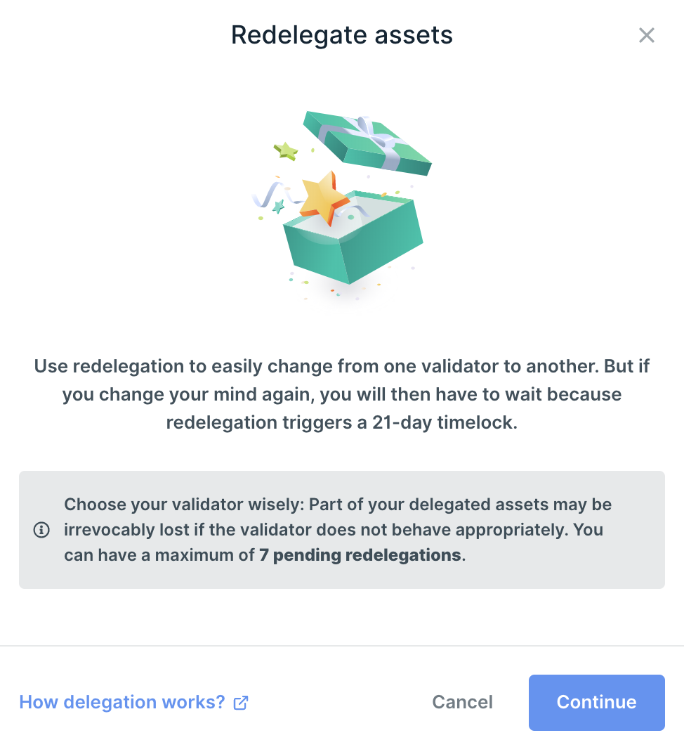 Lưu ý: Khi bạn redelegate tài sản, các phần thưởng đang chờ (pending rewards) sẽ được tự động nhận (cash-in). Việc này không tạo ra một giao dịch.