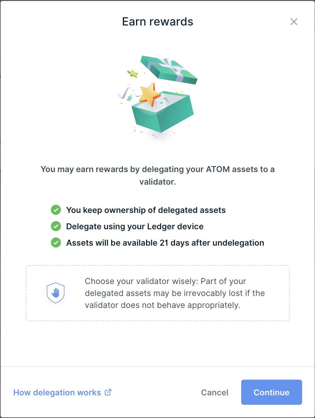 Kiếm phần thưởng Cosmos delegating rewards* bằng cách ủy quyền (delegate) ATOM của bạn qua Ledger Wallet.