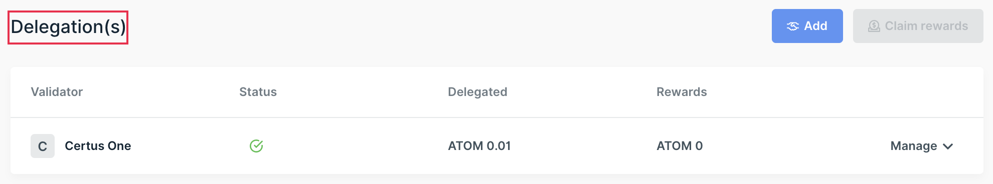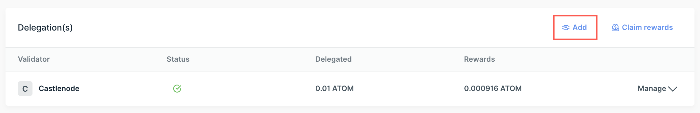 Nếu bạn đã ủy quyền nhưng muốn thêm validator mới: Vào mục Delegation(s) → nhấn Add để ủy quyền thêm.