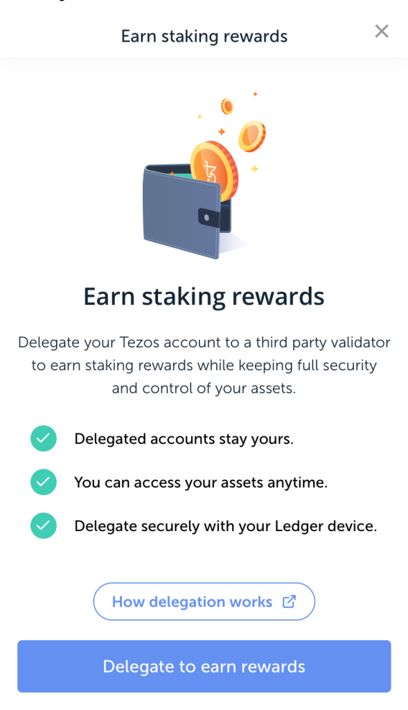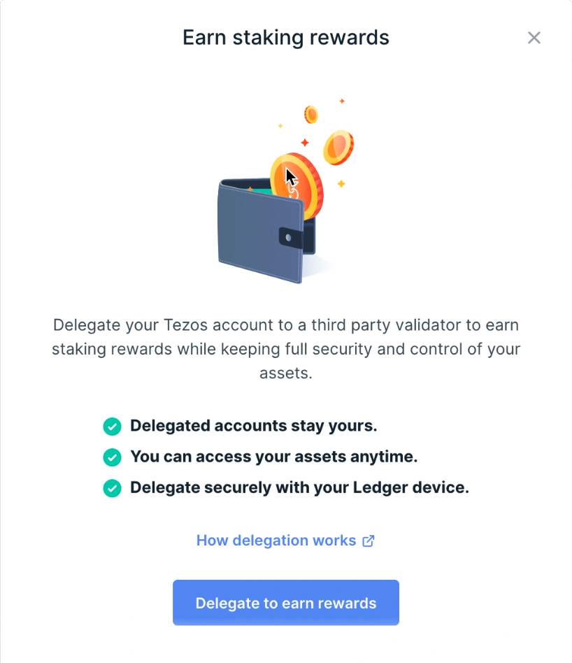 Nhận phần thưởng staking Tezos* bằng cách ủy quyền (delegating/staking) đồng Tezos (XTZ) của bạn. Tìm hiểu cách hoạt động của ủy quyền (delegation).