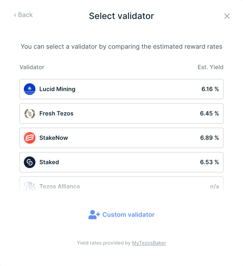 - Nhấp Select để chọn thủ công trình xác thực (validator). Bạn cũng có thể thêm trình xác thực (validator tùy chỉnh) bằng cách nhập địa chỉ validator. Tham khảo Baking Bad để biết thêm thông tin về validator.