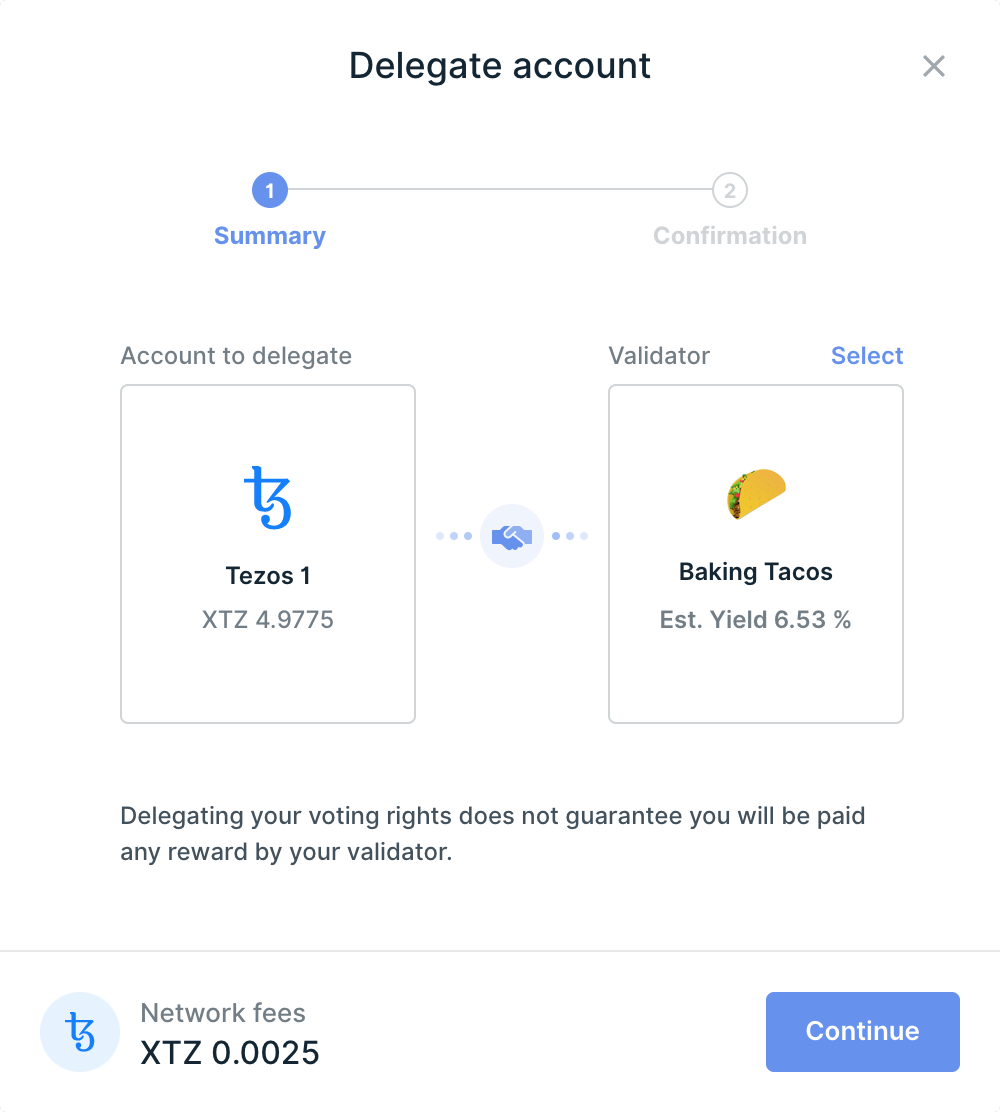 - Nhấp Continue tại bước Summary. Lưu ý: Việc ủy quyền quyền biểu quyết Tezos của bạn không đảm bảo trình xác thực (validator) sẽ trả thưởng cho bạn.