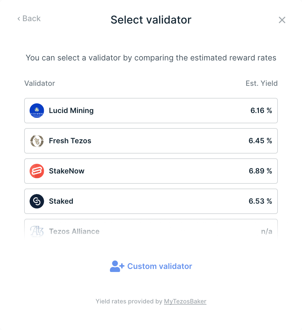 - Nhấp Select để chọn thủ công trình xác thực (validator). Bạn cũng có thể thêm trình xác thực (validator tùy chỉnh) bằng cách nhập địa chỉ validator. Tham khảo Baking Bad để biết thêm thông tin về validator.