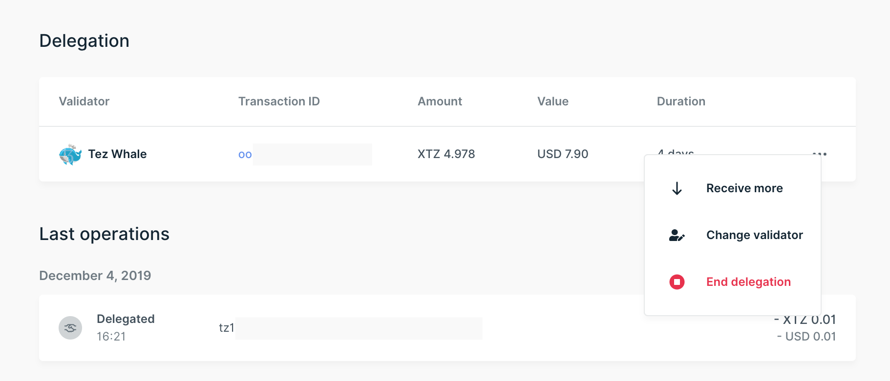 - Chọn Change validator (Thay đổi trình xác thực) hoặc End delegation (Kết thúc ủy quyền). Màn hình Summary (Tóm tắt) sẽ xuất hiện, cho phép bạn chọn thay đổi validator hoặc kết thúc ủy quyền.