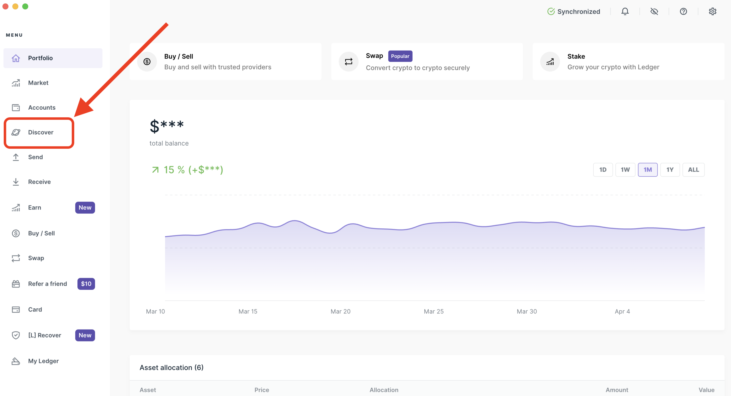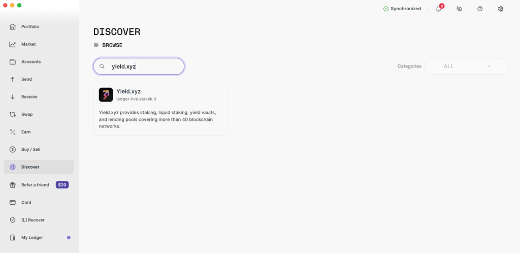 Ứng dụng Yield.xyz có sẵn trong mục Discover của Ledger Wallet. Cách truy cập như sau: