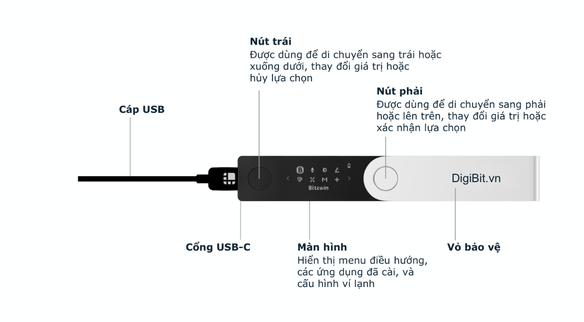 Trên thiết bị có 2 nút bấm vật lý, nhấn nút trái hoặc phải để di chuyển qua nội dung các màn hình, nhấn đồng thời 2 nút để lựa chọn thao tác, nhấn và giữ 2 nút để vào menu Settings xem dung lượng pin hoặc tắt ví.