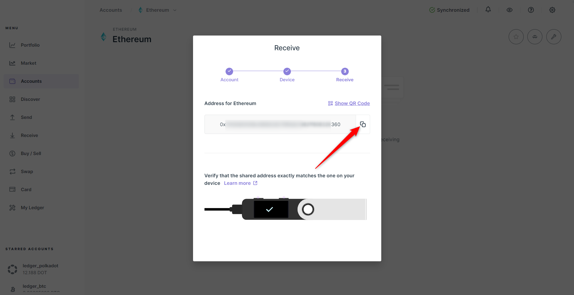 5. Sao chép địa chỉ nhận sau khi Ledger Wallet hiển thị.