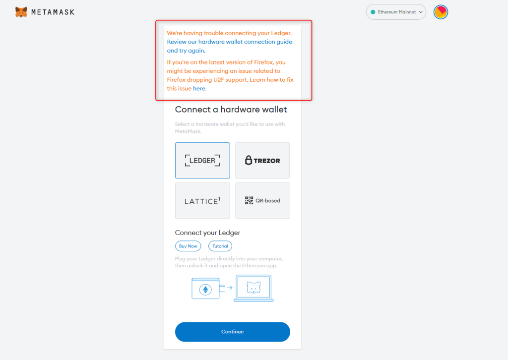 - Để tiếp tục sử dụng MetaMask với thiết bị Ledger, chúng tôi khuyến nghị bạn: Chuyển sang trình duyệt Chrome hoặc Brave cho đến khi đội ngũ Firefox phát hành bản sửa lỗi.