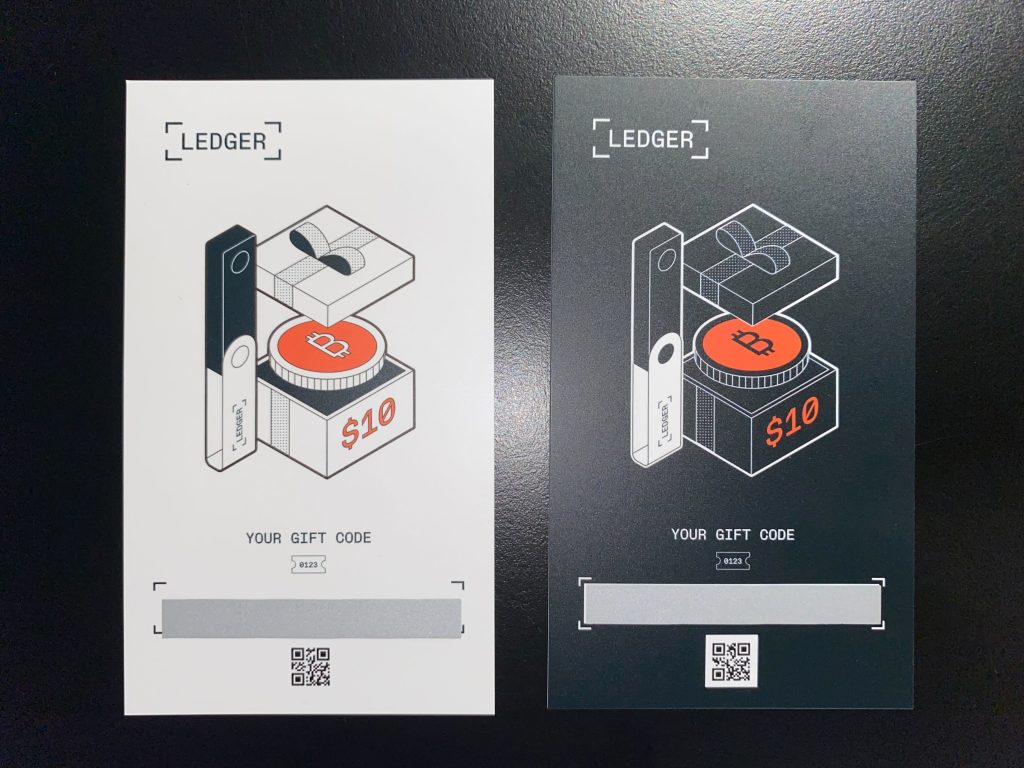 Voucher BTC: Bạn sẽ nhận được thẻ vật lý để claim crypto, đi kèm thiết bị Ledger và thẻ được đặt bên trong phong bì.