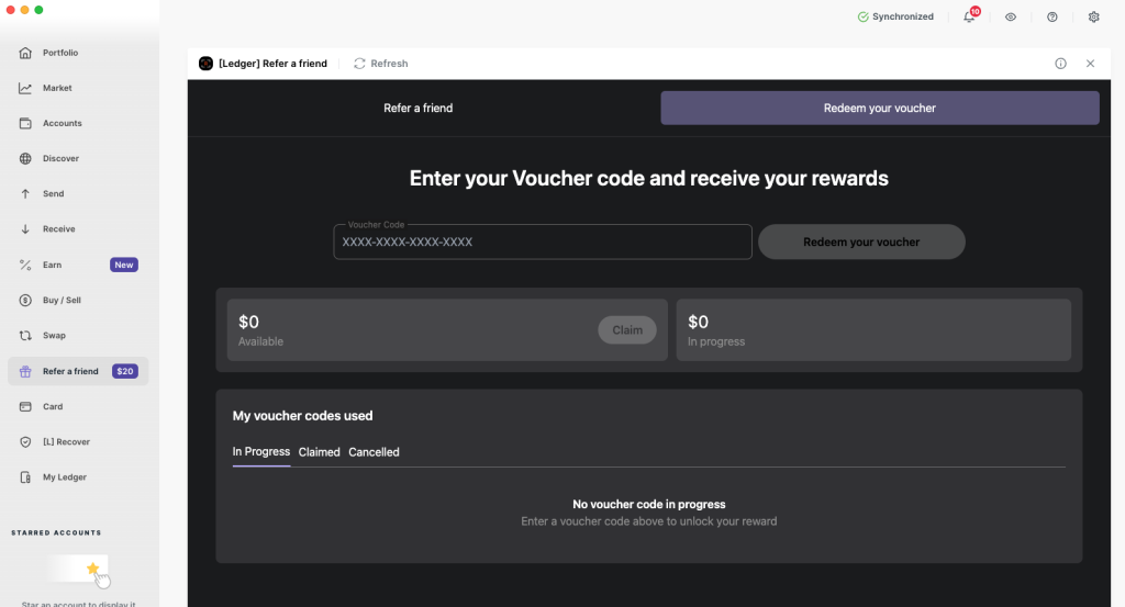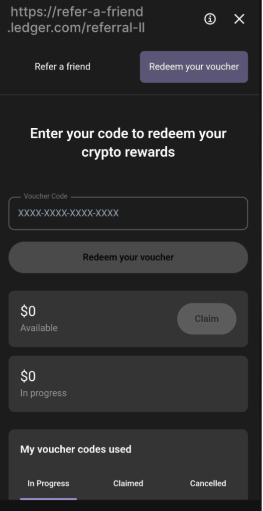 Bài viết này hướng dẫn cách nhập mã đổi thưởng (redemption code) và claim phần thưởng crypto. Quy trình này áp dụng cho các chương trình ưu đãi Black Friday, chương trình Bitcoin Halving, voucher Ledger Flex phiên bản Solana, ưu đãi Safe Journey và chương trình Refer a Friend.
