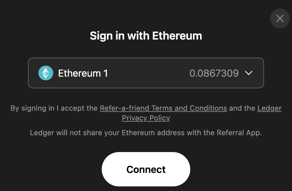 Nếu bạn không thấy phần thưởng trong mục Refer a Friend của Ledger Wallet, nguyên nhân có thể là bạn đang đăng nhập bằng sai tài khoản. Lưu ý, mục Refer a Friend bắt buộc đăng nhập bằng tài khoản Ethereum (ETH), phần thưởng được liên kết trực tiếp với địa chỉ ETH này. Nếu đăng nhập bằng tài khoản khác, phần thưởng sẽ không hiển thị.