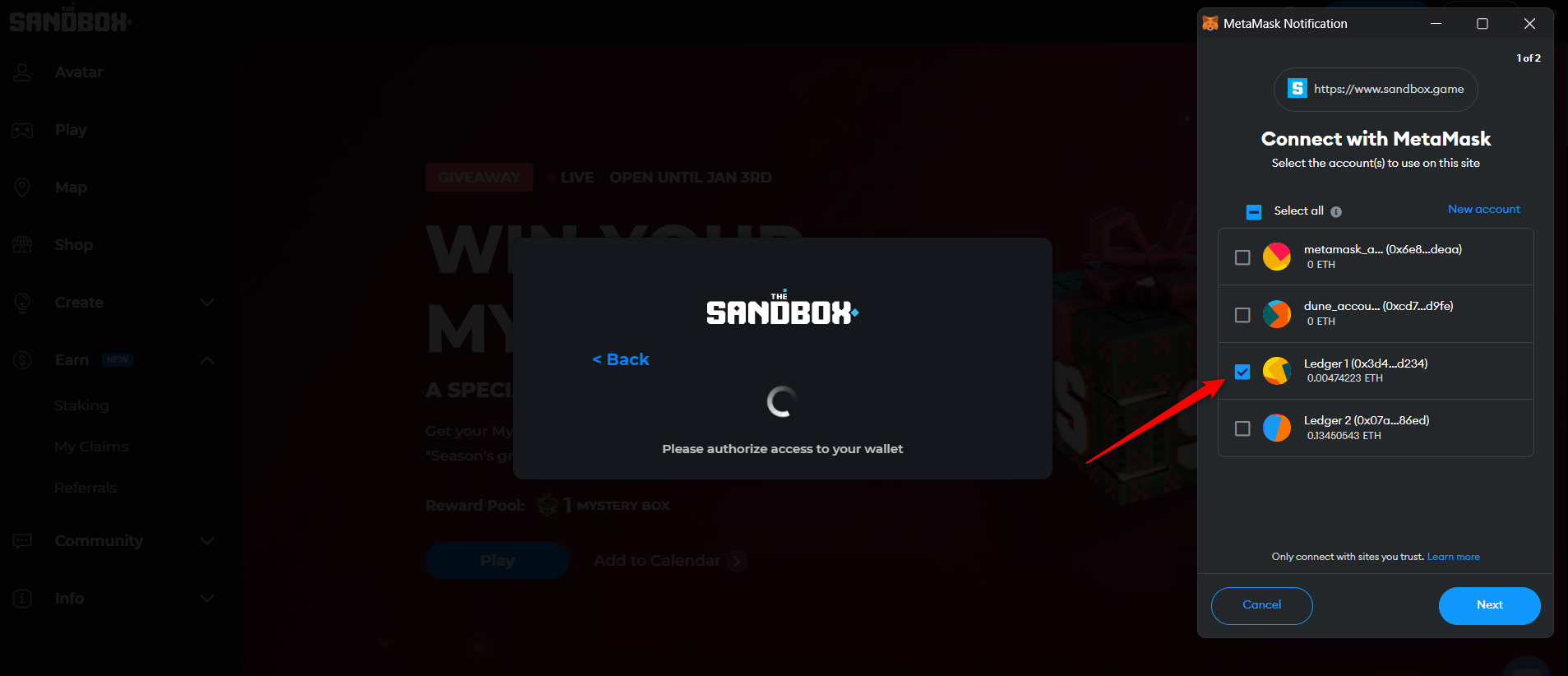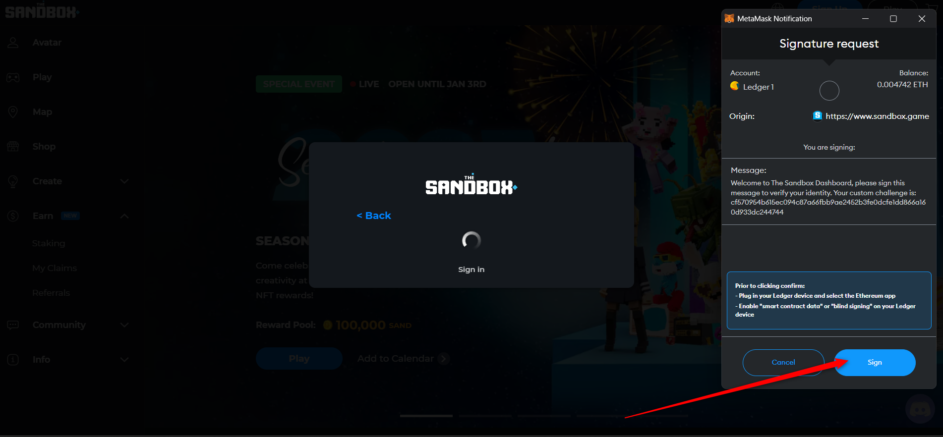 Trên thiết bị Ledger sẽ hiển thị thông báo: Sign message. - Sử dụng các nút bấm trên thiết bị Ledger để xác minh nội dung thông điệp. Nếu mọi thông tin đều chính xác, di chuyển đến Sign message và nhấn đồng thời cả hai nút để xác nhận. Tài khoản Ledger của bạn sẽ được kết nối với The Sandbox.