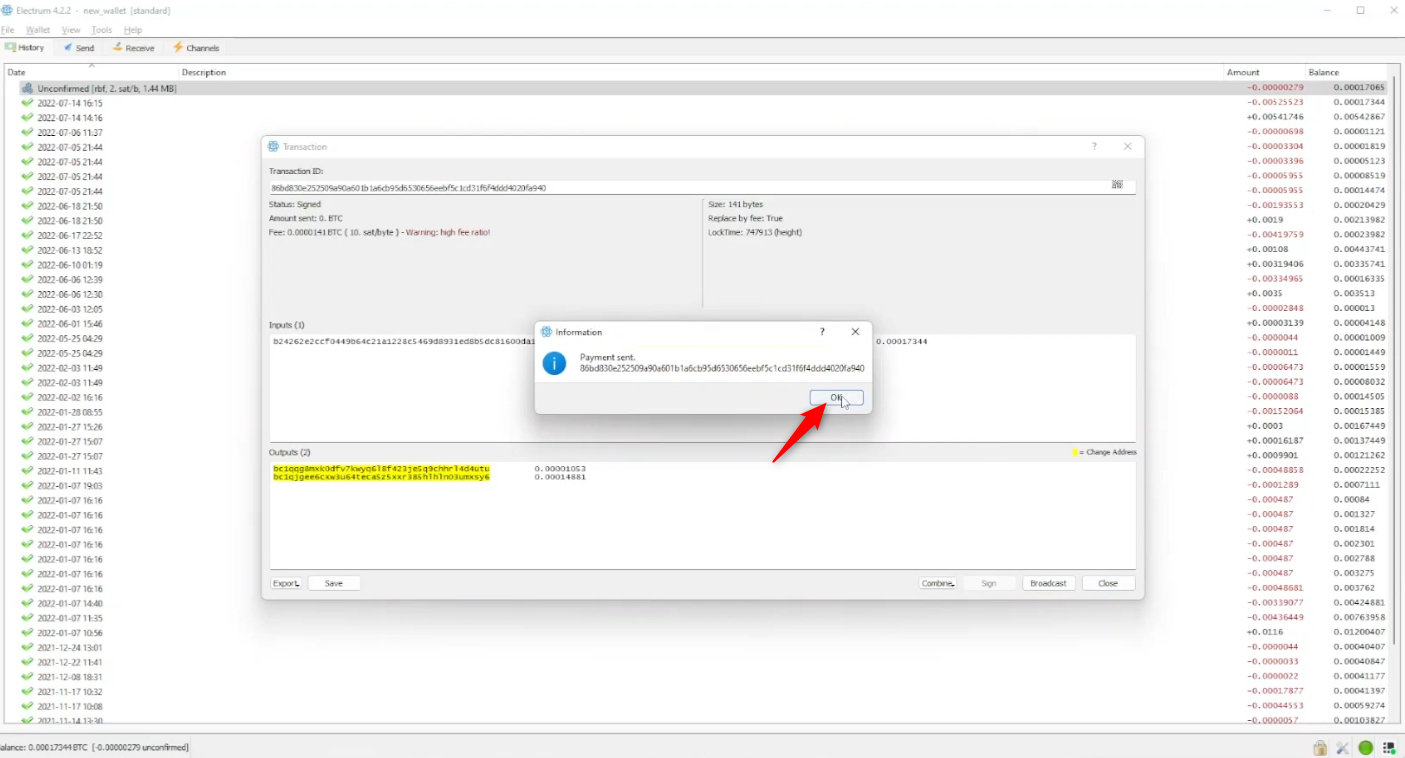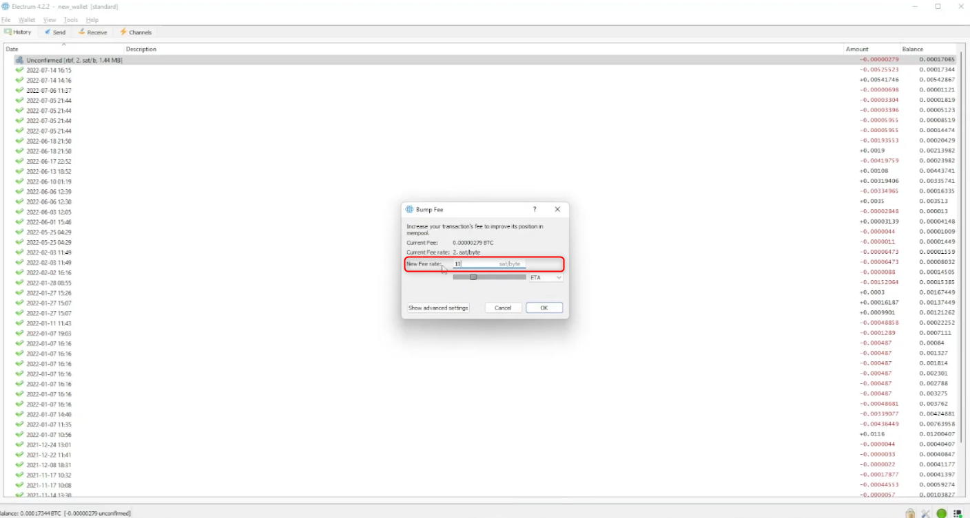 10. Trong ô New Fee rate, nhập mức phí mới (đơn vị sat/byte) → OK.